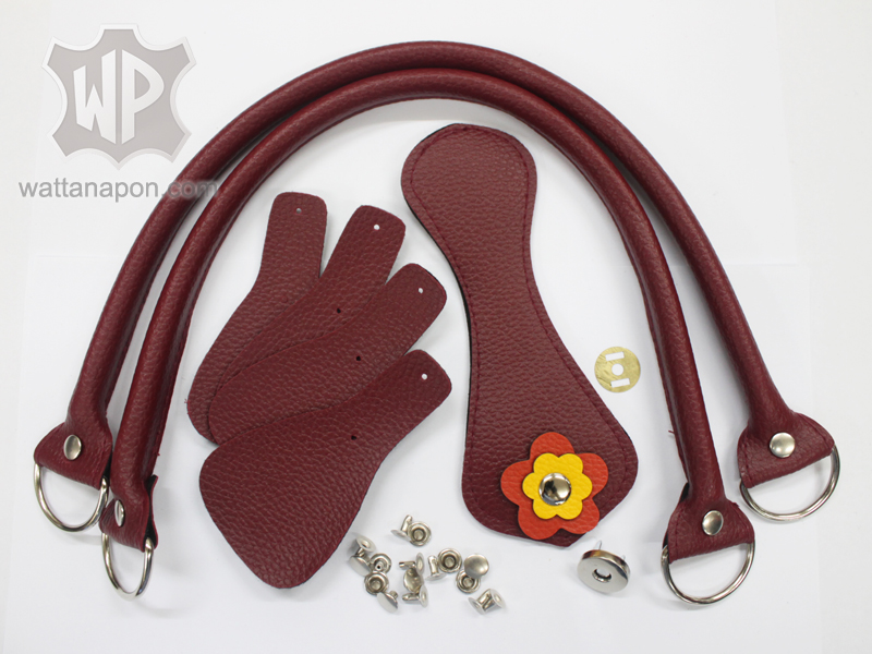 ชุดหูกระเป๋าพร้อมฝากระเป๋า ทำจากหนังเทียม ในชุดประกอบด้วย สายหูหิ้วกระเป๋าต่อห่วงยาว19นิ้ว 1 คู่ ฝาปิดกระเป๋ากระดุมแม่เหล็ก 1 ชิ้น ชิ้นข้อต่อระหว่างห่วงสายกระเป๋าและตัวกระเป๋า 4 ชิ้น พร้อมหมุดตอก